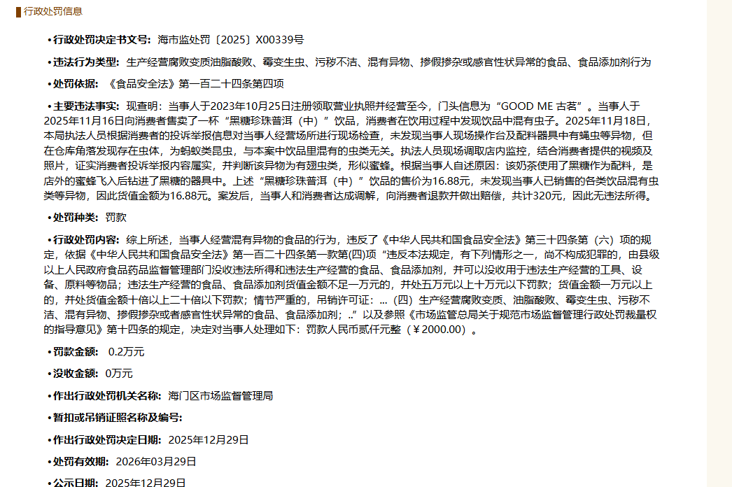 次要违法现实:现查明:当事人于2023年10月25日注册领取停业执照并运营至今,门头消息为“GOOD ME 古茗”。当事人于2025年11月16日向消费者售卖了一杯“黑糖珍珠普洱(中)”饮品,消费者正在饮用过程中发觉饮品中混有虫子。2025年11月18日,本局法律人员按照消费者的赞扬举报消息对当事人运营场合进行现场查抄,未发觉当事人现场操做台及配料器具中有蝇虫等异物,但正在仓库角削发现存正在虫体,为蚂蚁类虫豸,取本案中饮品里混有的虫类无关。法律人员现场调取店内,连系消费者供给的视频及照片,消费者赞扬举报内容失实,并判断该异物为有翅虫类,形似蜜蜂。按照当事分缘由:该奶茶利用了黑糖做为配料,是店外的蜜蜂飞入后钻进了黑糖的器具中。上述“黑糖珍珠普洱(中)”饮品的售价为16。88元,未发觉当事人已发卖的各类饮品混有虫类等异物,因而货值金额为16。88元。案发后,当事人和消费者告竣调整,向消费者退款并做出补偿,共计320元,因而无违法所得。当事人运营混有异物的食物的行为,根据《中华人平易近国食物平安法》第一百二十四条第一款第(四)项“违反本法,有下列景象之一,尚不形成犯罪的,食物添加剂,并能够用于违法出产运营的东西、设备、原料等物品;违法出产运营的食物、食物添加剂货值金额不脚一万元的,并处五万元以上十万元以下罚款;货值金额一万元以上的,并处货值金额十倍以上二十倍以下罚款;情节严沉的,吊销许可证:。。。(四)出产运营变质、油脂酸败、霉变生虫、不洁、混有异物、掺假或者感官性状非常的食物、食物添加剂;。。”以及参照《市场监管总局关于规范市场监视办理行政惩罚裁量权的指点看法》第十四条的,决定对当事人处置如下:罚款人平易近币贰仟元整(¥2000。00)。